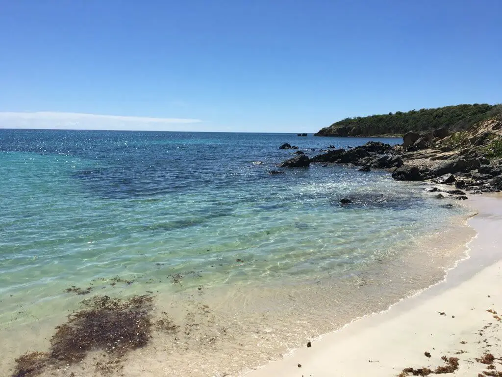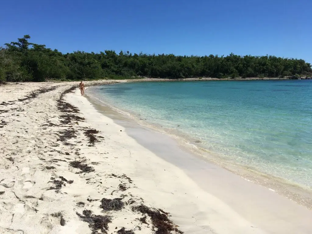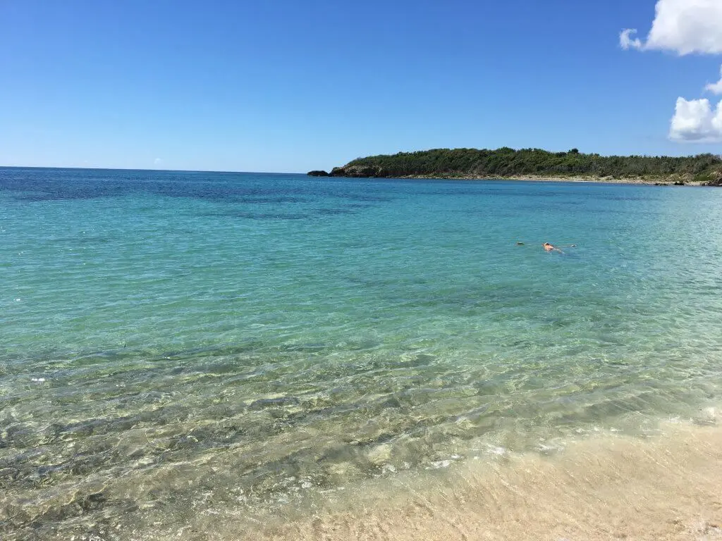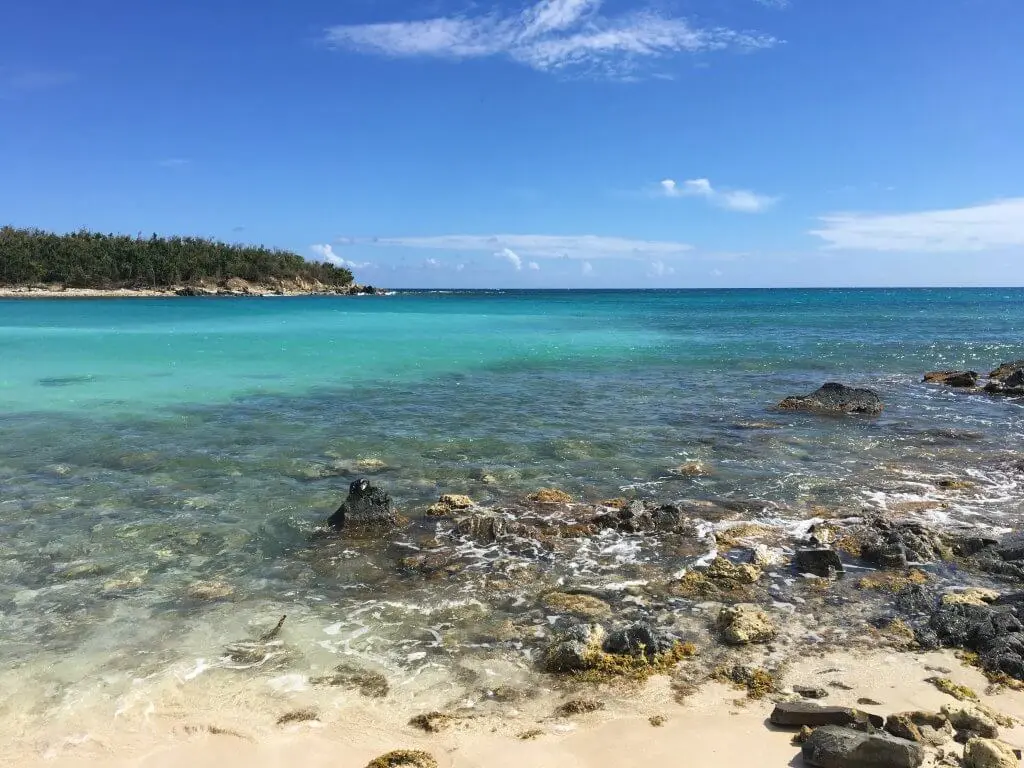 On the left (east) side of this beach there are large areas of broken coral but the rest of the beach is nice sand for walking. The water is beautiful and inviting with only small waves.