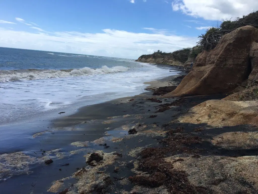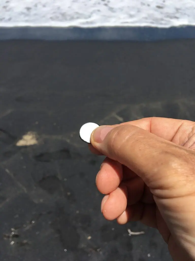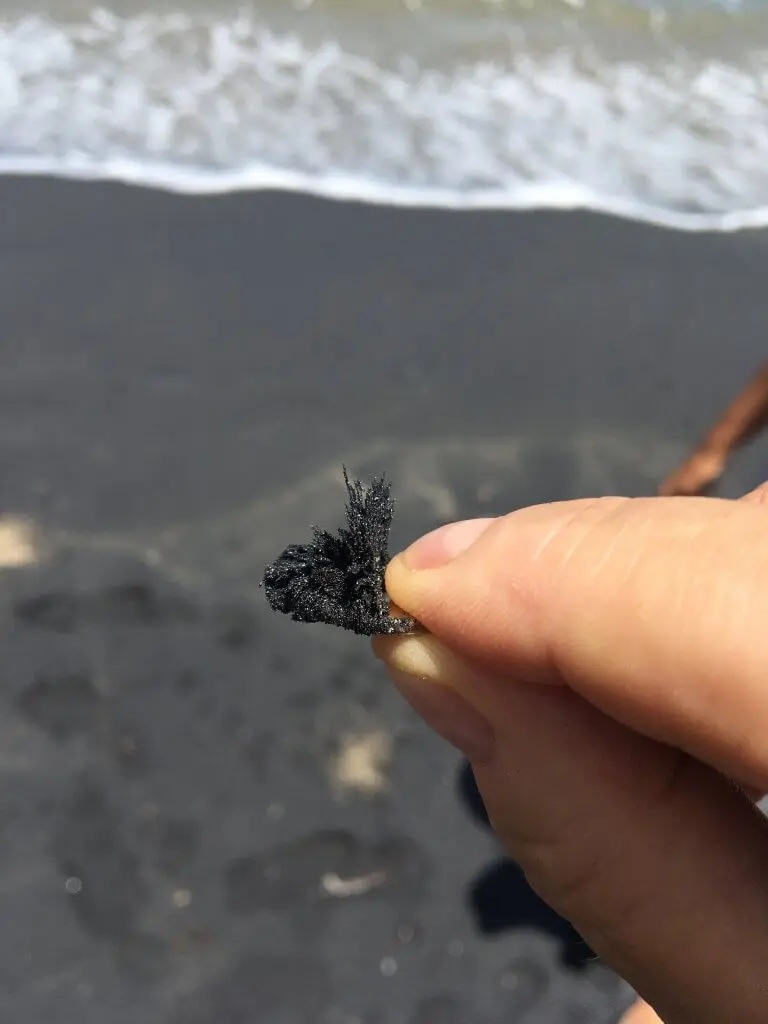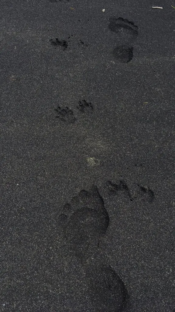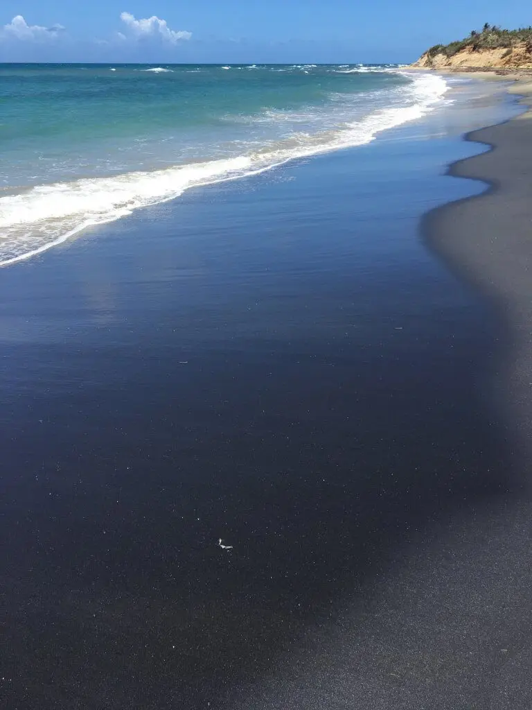 Jet-black magnetic sand and golden sand, varying with the tides and location along the beach.