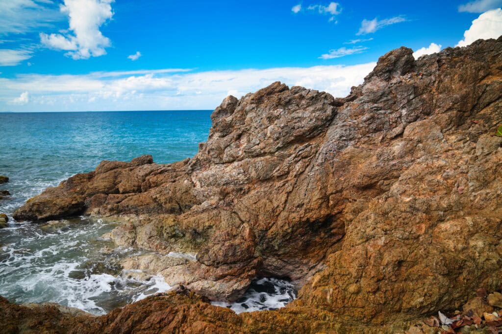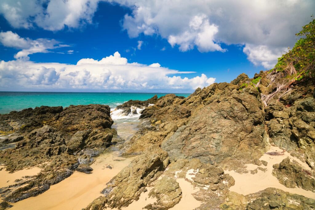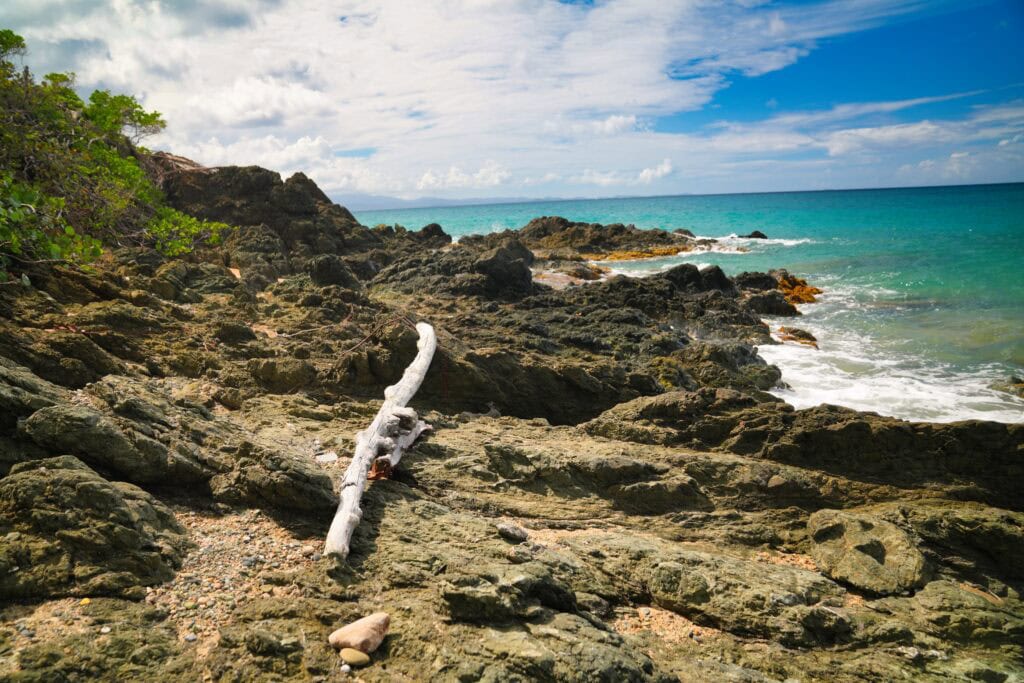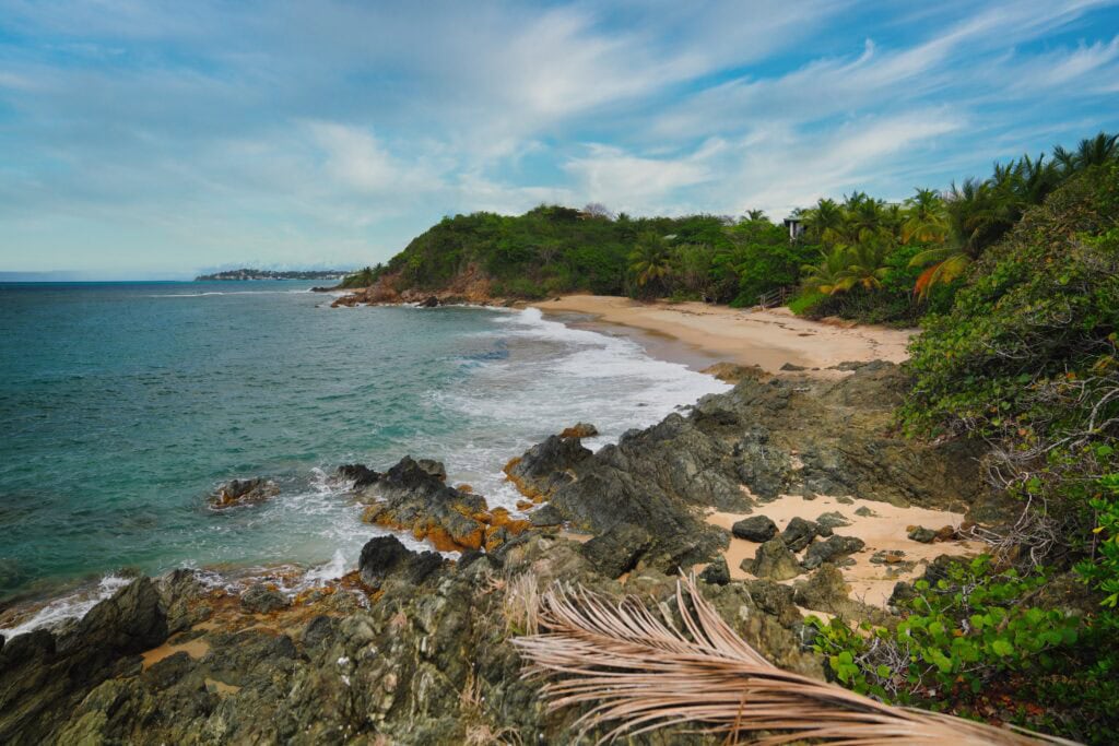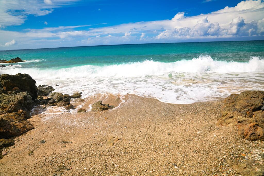 This beach is really a pair of two half moon beaches. They rest in front of the W resort, or what remains of it… damaged beyond repair by hurricane Maria the once beautiful resort now quietly decays more and more each year. It very unlikely you will see anyone else on these two beaches. They are not easily accessible. The best way I have found is to start at El Gallito beach and walk east over the rocks. Once on the other side you’ll see the first of the two half moons. They are a great place to find perfect shells because no one ever combs these beaches anymore. The rocks are very sharp so you will need to wear very good shoes and take your time. They are beautiful, clean beaches, strong waves and little shade is available. You can get a great view of the decaying W at the top of one of the rock beds, but stay out as it is still private property. Like all beaches in Puerto Rico however the beach is public! There is a small spitting cave towards the far right and a few other water/rock features that you can spend some time admiring.There is also a small but solid deposit of black sand on the far right side of this beach. So if you only have one day this might be a good beach to visit. You’ll be all alone, can beach comb and play in the black sand on your own “private beach”