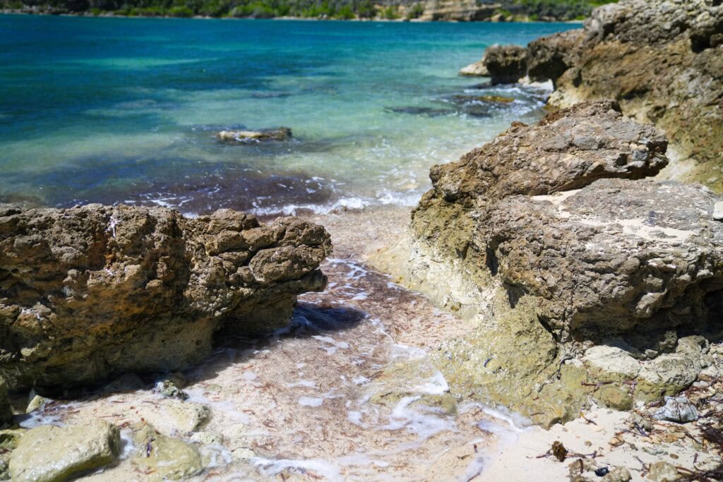La playa es pequeña, pero tiene una hermosa arena blanca. Hay rocas en cada extremo y se puede escalar y explorar. Hay algunos rincones de arena donde se puede refrescar en aguas poco profundas, pero no es una playa ideal para nadar.